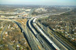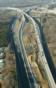These photos were taken on December 21, 2005 by the Virginia Department of Transportation, and are posted here with their permission. Roads to the Future utilized PhotoDeluxe Business Edition to sharpen and brighten all of the photos. Click on the photo to get a large version of the photo. In later versions of Netscape and Internet Explorer, you probably will need to use Full Screen mode (the F11 key can be utilized to swap back and forth between Full Screen and Regular) to see the full size of the large photo without browser-induced image shrinkage. The large photos have sizes ranging from 220 to 343 kilobytes, with most of them being under 265 kilobytes. With a broadband or network Internet connection, each photo will download within seconds, but with a dial-up Internet connection it will be slower. The photos are in sequence as taken from a helicopter as it made a couple loops around the interchange area.