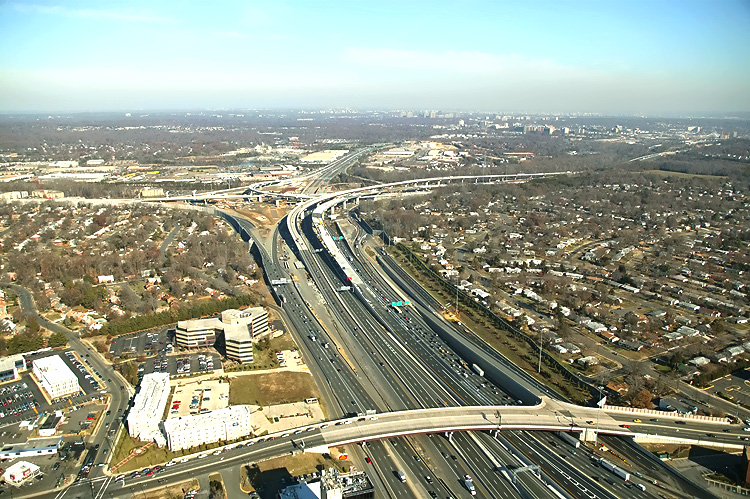 I-95/I-395/I-495 interchange construction, looking south toward Richmond. The Beltway runs left-right, and Shirley Highway runs up-down. Shirley Highway (I-95 south of the Beltway and I-395 north of the Beltway) has 3 mainline lanes each way and a 2-lane reversible roadway for high occupancy vehicle (HOV) traffic, and the reversible roadway is between the two general purpose roadways. The I-95/VA-644 interchange is in the distance. |