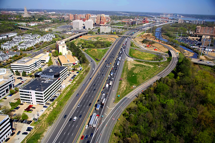 The I-95/I-495 Capital Beltway runs bottom to top, the Potomac River is in the upper part of the photo, the U.S. Route 1 Interchange construction is in the center part of the photo, and the Woodrow Wilson Bridge, and Maryland, is in the upper part of the photo. The under construction Beltway roadway to the right, is the Beltway Outer Loop local roadway.