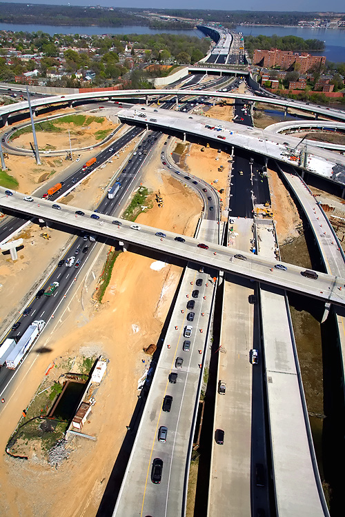 Interstate 295 Interchange construction, looking south. The long bridges carry I-295 over the I-95/I-495 Beltway. High capacity roadways and ramps have been constructed to make this a 4-way interchange, with the southerly extension heading into the National Harbor development which began construction in 2004, and which is visible in the distance. Website for National Harbor.