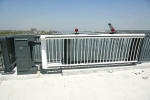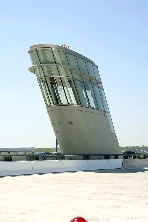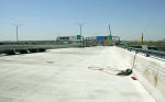Potomac River Bridge 6-lane Inner Loop bridge, nearing completion. This roadway is the local (outer) roadway of the Inner Loop (Virginia bound) of the Beltway. Standing near the concrete parapet between the roadway and the pedestrian path to the right on the other side of the concrete barrier. The widened semi-circular section of the path (of which there will a number of them), is for pedestrians to have a place to view the scenery, and be out of the way of the pedestrian and bicycle traffic. Potomac River Bridge 6-lane Inner Loop bridge, nearing completion. This roadway is the 3-lane local (outer) roadway of the new 6-lane Inner Loop Potomac River Bridge. Near the highest point of the bridge (notice the new drawbridge Operator's Tower at the right edge of the photo). Looking against the flow (toward Maryland) of the future traffic. Potomac River Bridge 6-lane Inner Loop bridge, nearing completion. This roadway is the 3-lane local (outer) roadway of the new 6-lane Inner Loop Potomac River Bridge. Near the highest point of the bridge. Looking against the flow (toward Maryland) of the future traffic. The new drawbridge Operator's Tower, which is located between the two new bridges, at the Virginia end of the bascule span. The forward-leaning part of the tower 'leans' over the drawspan to provide the necessary visibility for the operator. This tower is considerably smaller than the original tower, as the higher vertical navigational clearance (70 feet new, versus 50 feet original) under the drawspan when closed, means far fewer (about one per week) drawspan openings will be needed, therefore the human operator will only need to be there occasionally. Potomac River Bridge construction, looking west from just west of the bascule spans, looking toward Virginia. To the left is the new 6-lane Outer Loop Potomac River Bridge. This roadway is the 3-lane local (outer) roadway of the under-construction new 6-lane Inner Loop Potomac River Bridge. Notice the pedestrian path to the right on the other side of the concrete barrier; there will be a separate pedestrian/bicycle trail on the north side of the second new Woodrow Wilson Bridge, and the trail will carry pedestrian/bicycle traffic between US-1 south of Alexandria and pedestrian/bicycle trails in Maryland. Potomac River Bridge 6-lane Inner Loop bridge, nearing completion. This roadway is the 3-lane local (outer) roadway of the Inner Loop (Virginia bound) of the Beltway. The Virginia Potomac River shoreline is almost directly under the Virginia welcome sign. WWB Project construction, photo taken from the roof of a Hunting Towers Apartment building in Alexandria, Virginia, showing the recently-opened (in June and July of 2006) new 6-lane Outer Loop Potomac River Bridge, which is currently configured to carry 3 Beltway Outer Loop lanes and 3 Beltway Inner Loop lanes. The new 6-lane Inner Loop Potomac River Bridge, to the left of the Outer Loop bridge, is nearing completion, with all foundations built, all superstructure beams placed, and all of the roadway deck has been constructed. WWB Project construction, photo taken from the roof of a Hunting Towers Apartment building. WWB Project construction, photo taken from the roof of a Hunting Towers Apartment building. Closer view of the roadway deck construction on the Inner Loop bridge at the Virginia end of the bridge. Notice the new pylon with the name of the new bridge, carrying the same name as the original bridge, the Woodrow Wilson Memorial Bridge, and carrying the same medallion of President Woodrow Wilson which was formerly on the side of the original bridge's drawspan control tower. WWB Project construction, photo taken from the roof of a Hunting Towers Apartment building. View of the roadway deck construction on the Inner Loop bridge at the Virginia end of the bridge, and the Virginia land approach construction. Notice the sound barrier under construction on the north (left) edge of the Inner Loop bridge. A 1,550-foot transparent wall on the new Wilson Bridge will provide soundproofing for Old Town Alexandria residents while preserving the view from the bridge; and the wall, made of acrylic panels called Paraglas, will be 17 feet tall.
