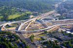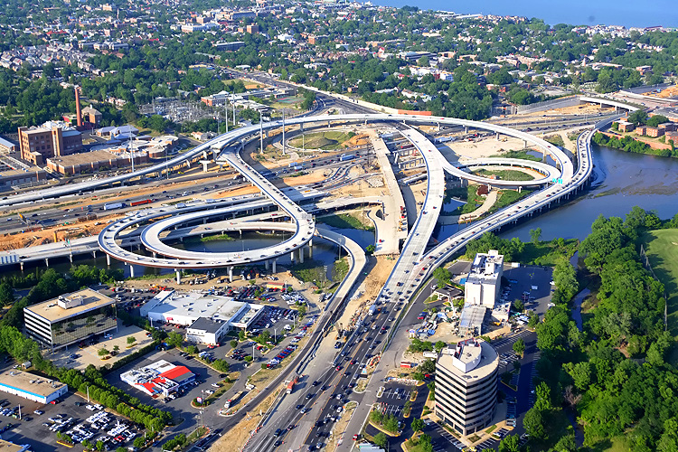 U.S. Route 1 Interchange construction, looking north across Hunting Creek and the I-95/I-495 Capital Beltway, with Alexandria on the north side of the Beltway. U.S. Route 1 Interchange construction, looking north across Hunting Creek and the I-95/I-495 Capital Beltway, with Alexandria on the north side of the Beltway. Mount Vernon Memorial Highway runs from the bottom of the photo, upward past the apartment complex where the Mount Vernon Memorial Highway becomes Washington Street, and Washington Street crosses the Beltway and goes into Old Town Alexandria. The Beltway runs left-right across the center of the photo. The Washington Street Urban Deck is under construction in the center of the photo. Old Town Alexandria is in the upper part of the photo, and National Airport, and downtown Washington, D.C., is in the far distance. U.S. Route 1 Interchange construction, looking west across Hunting Creek and the I-95/I-495 Capital Beltway, with Alexandria on the north side of the Beltway. The Beltway heads west into the distance in the upper left of the photo. Looking west along the Beltway, showing construction of the U.S. Route 1 Interchange. The upward curving elevated ramp at the bottom of the photo is the newly opened flyover ramp from northbound US-1 to the Beltway Inner Loop (toward Springfield), and this ramp opened to traffic on May 6, 2007. Looking south along US-1, showing construction of the U.S. Route 1 Interchange. The upward curving elevated ramp at the bottom of the photo is the newly opened flyover ramp from northbound US-1 to the Beltway Inner Loop (toward Springfield). Looking south along US-1, showing construction of the U.S. Route 1 Interchange. Looking south along US-1, showing construction of the U.S. Route 1 Interchange. The I-95/I-495 Capital Beltway runs lower right to upper left, the Potomac River is in the upper part of the photo, the U.S. Route 1 Interchange construction is in the center of the photo. Virginia is on this side of the Potomac River, and Maryland is on the opposite side. The I-95/I-495 Capital Beltway runs bottom to top, Hunting Creek (also known as Cameron Run) is just to the right of the Beltway, the Potomac River is in the upper part of the photo, the U.S. Route 1 Interchange construction is in the upper part of the photo. Notice the elevated ramps under construction in the center left of the photo, they are part of the local ramps that will connect the Eisenhower Valley in Alexandria, Virginia, to the Beltway's traffic to and from Maryland. The I-95/I-495 Capital Beltway runs bottom to top, Hunting Creek is just to the right of the Beltway, the Potomac River is in the upper part of the photo, the U.S. Route 1 Interchange construction is in the upper part of the photo, and the Woodrow Wilson Bridge is in the upper part of the photo. The long new bridge on the right side of the Beltway, is part of the completed US Route 1 Interchange Advanced Bridge contract, and the bridge will carry the Beltway Outer Loop local roadway; currently it is carrying local traffic exiting the Beltway to US-1. U.S. Route 1 Interchange construction, looking east along the I-95/I-495 Capital Beltway, with Alexandria on the north side of the Beltway, and the Potomac River, the Woodrow Wilson Bridge, and Maryland, visible in the distance. Woodrow Wilson Bridge and Potomac River in the center of the photo, Old Town Alexandria is in the lower part of the photo. The construction on the Maryland side of the river is National Harbor. Website for National Harbor.