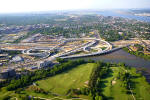 The I-95/I-495 Capital Beltway runs left to right, the Potomac River is in the lower part of the photo, the U.S. Route 1 Interchange construction is mostly off the left edge of the photo, and the Woodrow Wilson Bridge begins in the right of the photo. Old Town Alexandria, Virginia is in the upper part of the photo. The Washington Street Urban Deck is under construction in the left of the photo. Zoom-in excerpt of the previous photo, showing the Washington Street Urban Deck under construction. The reinforced concrete structure of the deck is complete, and about 6 feet depth of earthen fill is being placed on the portions of the deck where grass and trees are being planted. Photo size is 484 kilobytes. Virginia approaches construction to the Potomac River Bridge, looking north. Construction in the foreground is the Potomac River Bridge Virginia Approach Spans contract, and the new 6-lane Outer Loop WWB is visible, and it is carrying 3 lanes each way until the second new 6-lane Inner Loop WWB, which is under construction above the new bridge, opens to traffic in mid-2008. The new Virginia abutment for the Potomac River Bridge is visible in the left of the photo. Virginia approaches construction to the Potomac River Bridge, looking west. Construction in the foreground is the Potomac River Bridge Virginia Approach Spans contract, and the new 6-lane Outer Loop WWB is visible to the left, and it is carrying 3 lanes each way until the second new 6-lane Inner Loop WWB, which is under construction to the right, opens to traffic in mid-2008. The new Virginia abutment for the Potomac River Bridge is visible in the center of the photo, and the land approach construction is visible above that, and the Washington Street Deck construction is visible, with the U.S. Route 1 Interchange construction visible in the distance. Virginia approaches construction to the Potomac River Bridge, looking west. Construction in the foreground is the Potomac River Bridge Virginia Approach Spans contract, and the new 6-lane Outer Loop WWB is visible to the left, and it is carrying 3 lanes each way until the second new 6-lane Inner Loop WWB, which is under construction to the right, opens to traffic in mid-2008. Old Town Alexandria, Virginia, looking north from above the Woodrow Wilson Bridge. More details in the following photos.