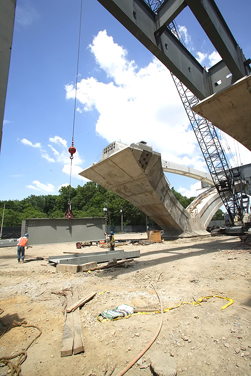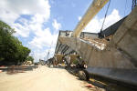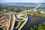 Potomac River Bridge construction, looking south, view of the Potomac River Bridge Maryland Approach Spans contract construction. Potomac River Bridge construction, looking south, view of the Maryland Approach Spans construction. The old closed 6-lane Woodrow Wilson Bridge is visible on the near side of the new bridge construction. Notice the Beltway traffic on the opposite-side new bridge. Potomac River Bridge construction, looking south, view of the Maryland Approach Spans construction. The Maryland approach of the old closed 6-lane Woodrow Wilson Bridge is visible on the near side of the new bridge construction, and the old WWB bascule span has been removed. The Bascule Span construction of the new WWB, which is being built under the Potomac River Bridge Bascule Spans contract, is visible in the right of the photo. Potomac River Bridge construction, looking south, view of the Maryland Approach Spans construction and Bascule Spans construction. The Maryland approach of the old closed 6-lane Woodrow Wilson Bridge is visible on the near side of the new bridge construction, and the old WWB bascule span has been removed. The Maryland approach of the old closed 6-lane WWB is currently being used a construction access road to bring concrete and materials to the construction site of the Maryland approach of the new Inner Loop WWB.