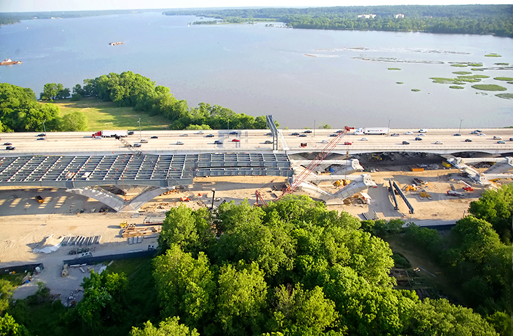 Potomac River Bridge construction, looking south, view of the Maryland Approach Spans construction and Bascule Spans construction. The Maryland approach of the old closed 6-lane Woodrow Wilson Bridge is visible on the near side of the new bridge construction, and the old WWB bascule span has been removed. Construction in the center of the photo is the Potomac River Bridge Virginia Approach Spans contract. Jones Point is visible in the upper center of the photo. The Potomac River heads to the south in the distance. Construction of the WWB Virginia Approach . The first new 6-lane bridge is open, and the second new bridge is under construction on the near side, notice the superstructure under construction on the Virginia overland approach. Construction of the WWB Virginia Approach. The first new 6-lane bridge is open, and the second new bridge is under construction on the near side, notice the superstructure under construction on the Virginia overland approach, where steel girders have been placed, with the construction of the reinforced concrete roadway deck to follow. Construction of the WWB Virginia Approach. Jones Point is visible in the upper center of the photo. The Potomac River heads to the south in the distance. Construction of the WWB Virginia Approach. Jones Point is visible in the upper center of the photo. The Potomac River heads to the south in the distance. The first new 6-lane bridge is open, and the second new bridge is under construction on the near side, notice the V-piers under construction on the Virginia overland approach. Construction of the WWB Virginia Approach. Jones Point is visible in the upper left of the photo. The Potomac River heads to the south in the distance. The first new 6-lane bridge is open, and the second new bridge is under construction on the near side, notice the V-piers under construction on the Virginia overland approach. Potomac River Bridge construction, looking east from Virginia into Maryland. The new 6-lane Outer Loop bridge is to the right. The under construction 6-lane Inner Loop bridge is to the left. The Virginia abutment (terminal structure) of the new bridge is in the lower right of the photo. Potomac River Bridge construction, looking east from Virginia into Maryland. The new 6-lane Outer Loop bridge is to the right. The under construction 6-lane Inner Loop bridge is to the left. The Virginia abutment (terminal structure) of the new bridge is in the lower center of the photo. **LATEST INFORMATION UPDATE follows**